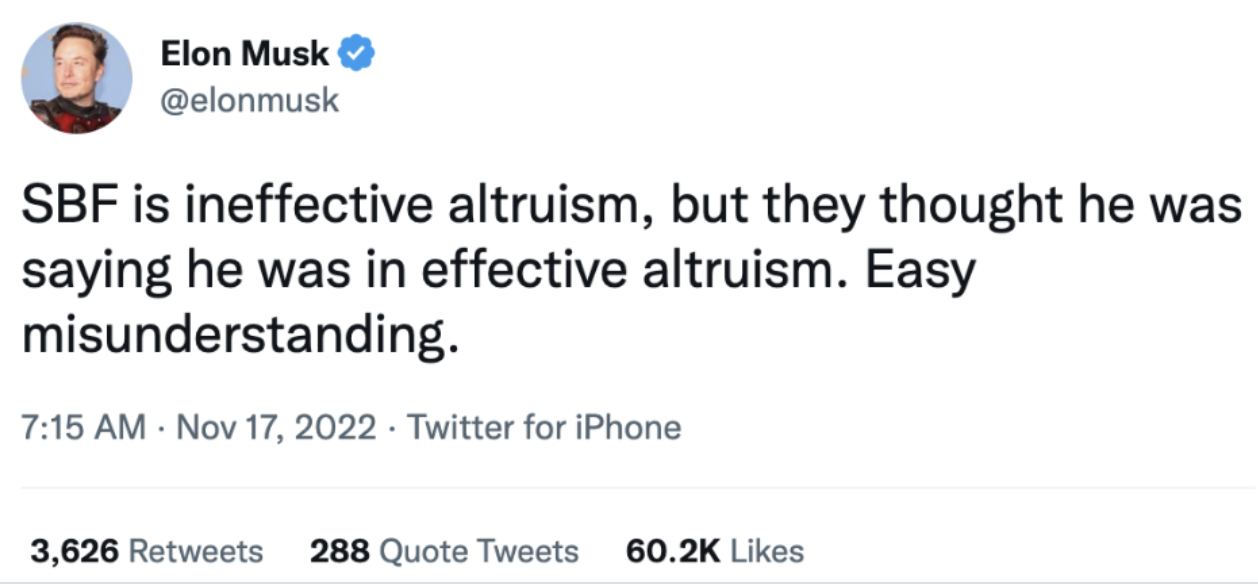 From a personal perspective, aside from hurting my crypto wallet, SBF’s behavior also casts a shadow over my own work; as an investor and grant-maker to venture-backed, pre-IPO companies, SBF’s behavior certainly does not help my cause. As Elon Musk (who has attended EA conferences in the past and was just featured in a related Forbes article) joked in a recent tweet (🙄),